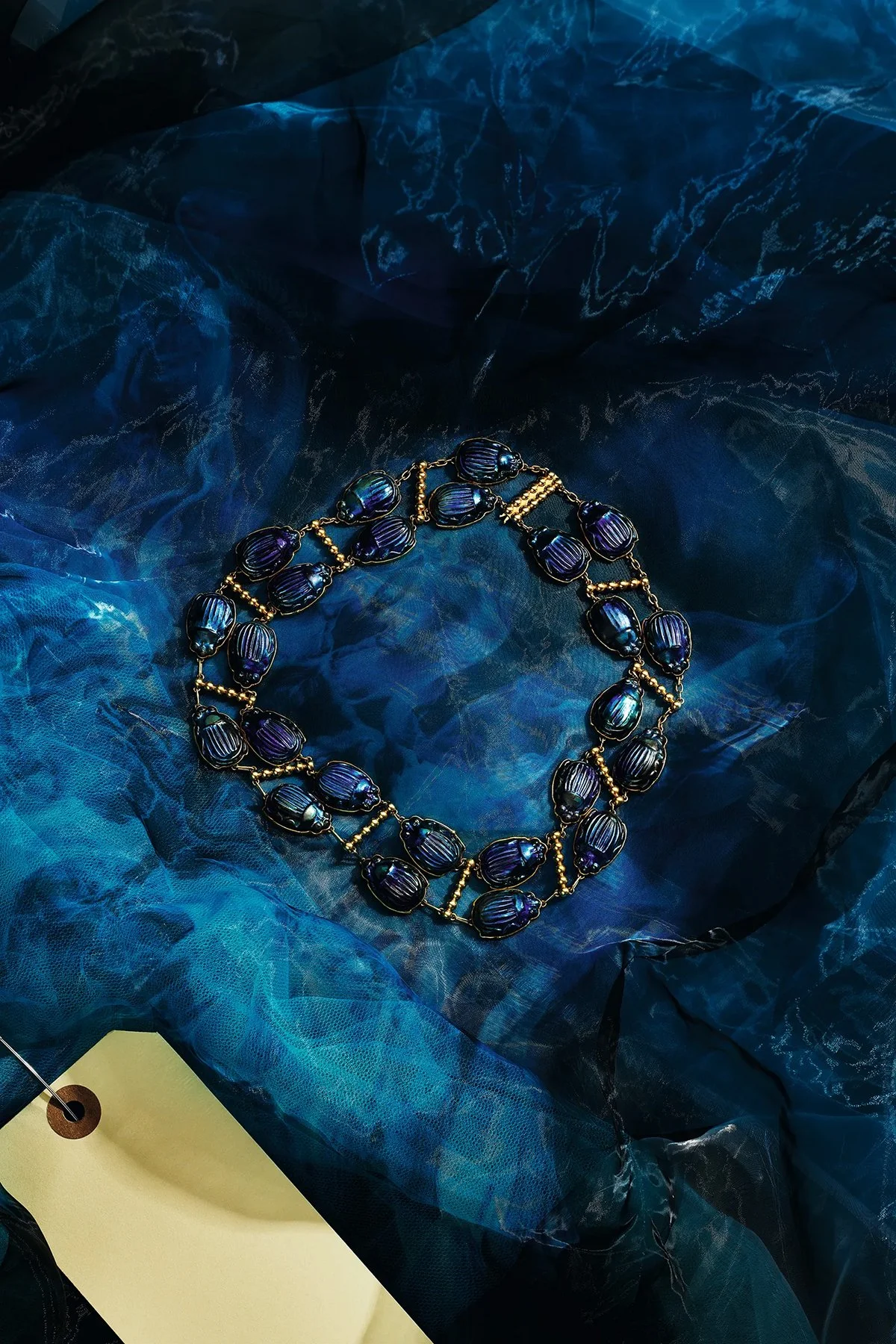 One of the most ravishing pieces she wears is a 1914 necklace designed by Meta Overbeck, made of gold and set with Favrile glass scarabs. Each beetle was carefully crafted in Louis Comfort Tiffany’s glassworks in Corona, Queens, with a magnificent blue-green iridescence. There is a scene in which Elizabeth is painting a watercolor of a beetle crawling on her hand.