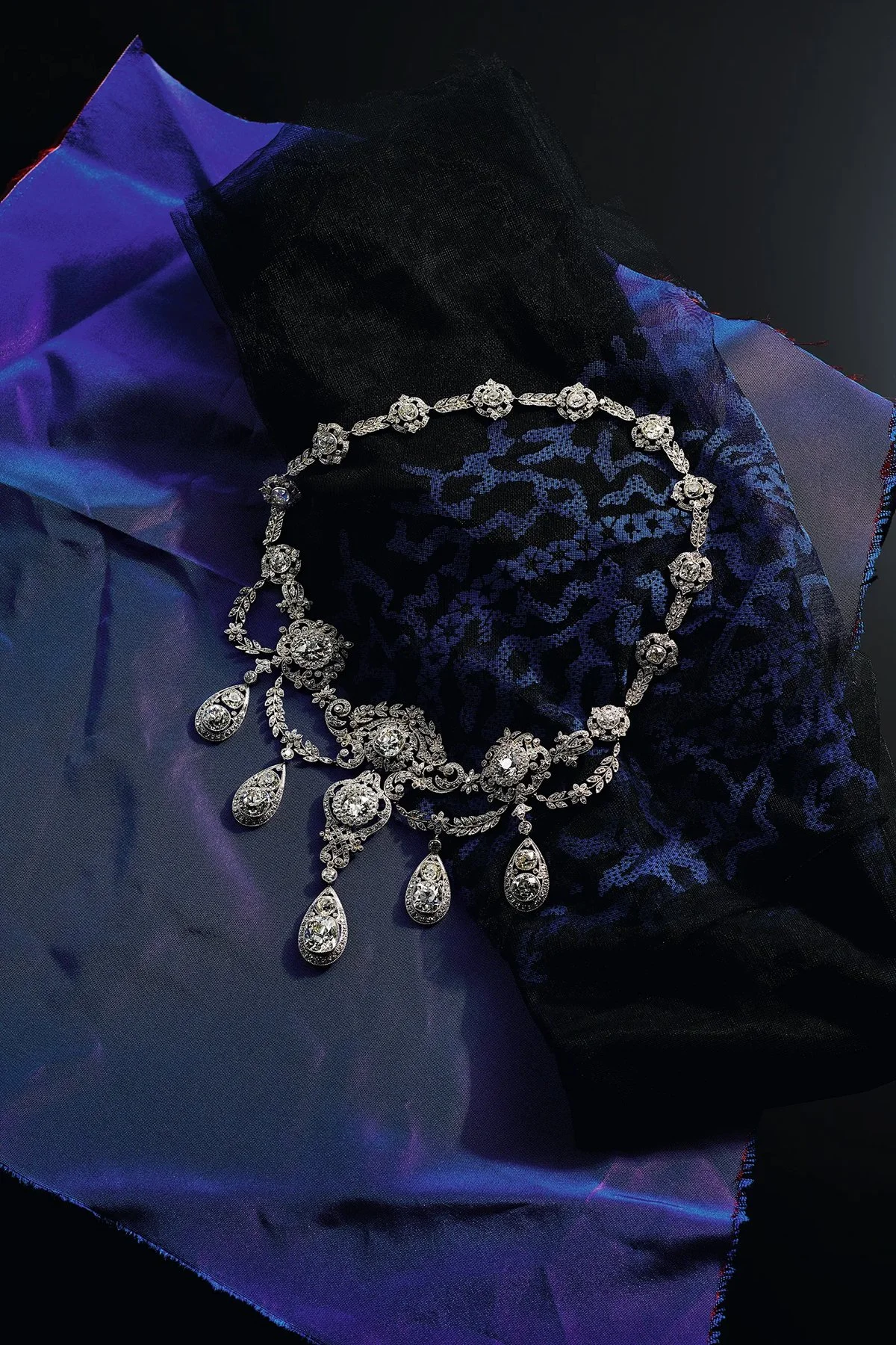 Another stunning piece featured in the film is the Wade Garland Necklace: a Paulding Farnham design from 1900, set with more than 40 carats of European-cut diamonds in an open-flower pattern. The necklace hadn’t been worn since 1900. A real masterpiece defined by platinum exquisite craftsmanship, its floral motifs, with diamonds set in fine millegrain, give it a lace-like effect, depicting the period.