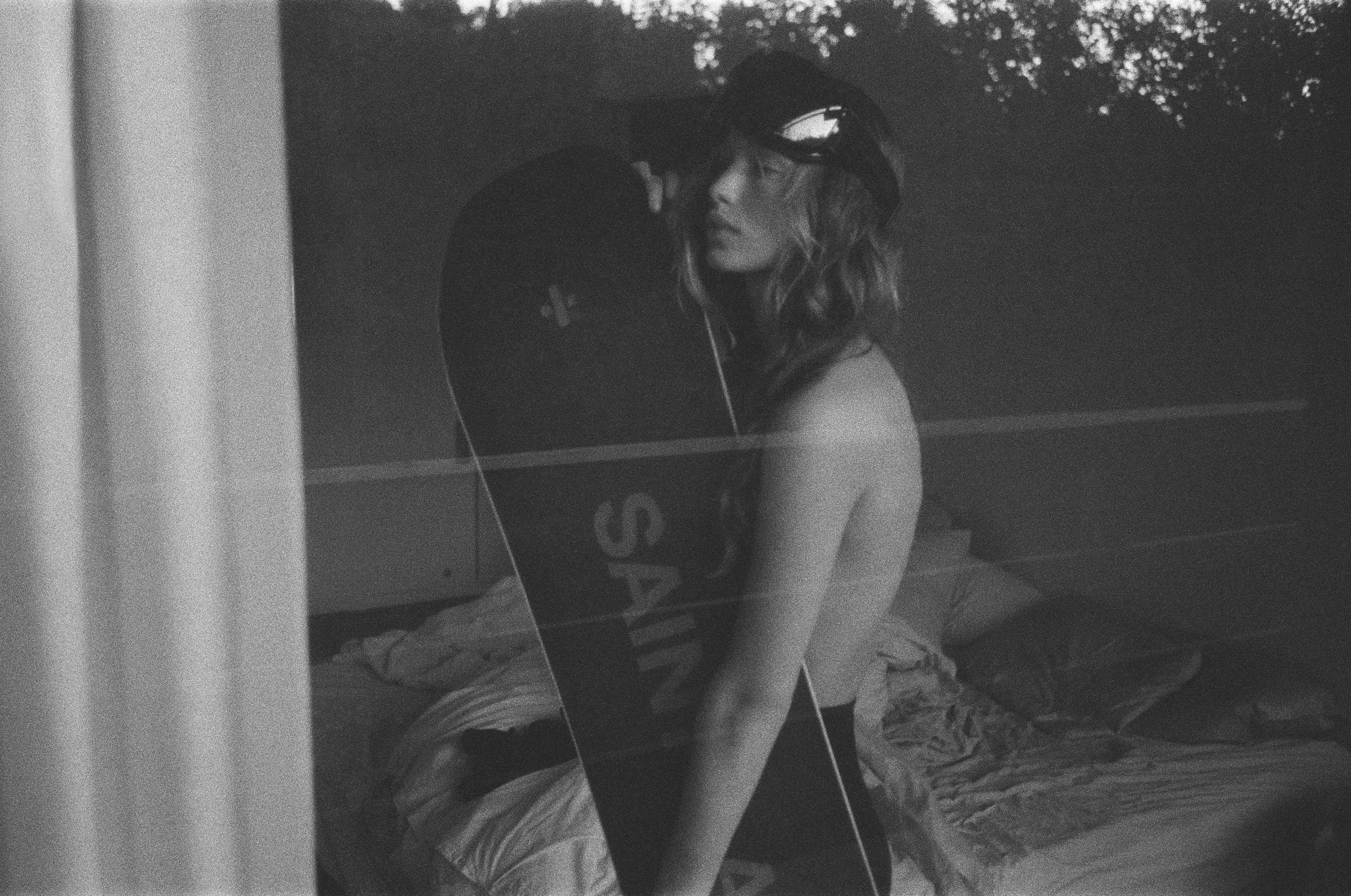 The collection also includes a black wooden sledge, a black Eretic snowscoot, and two black Salomon helmets.